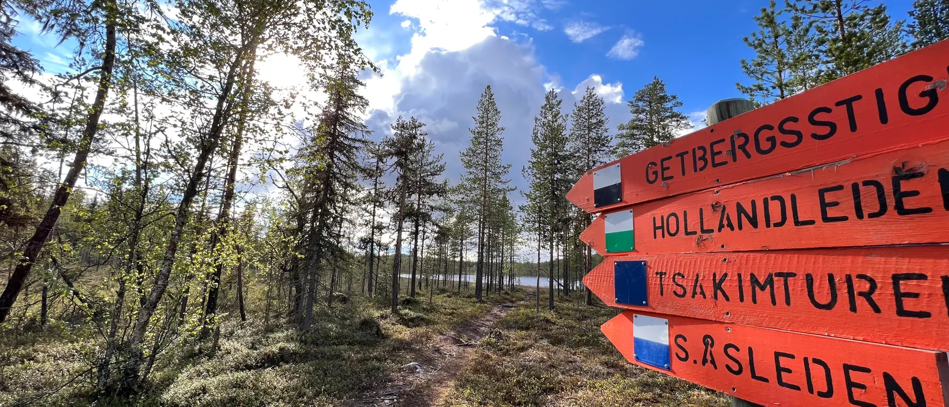 Hollandleden är markerad med vit/grön färg och kan startas från Skabram camping. Leden går över en långmyr, där spångar finns på de blötaste partierna. Efter myren ansluter leden till Tsakimturen, men en bit senare skiljer sig stigarna åt. Hollandleden fortsätter upp genom blandskog och når högre, torrare mark med vackra berghällar. Leden slutar eller börjar vid hundspårets 10 km-slinga.